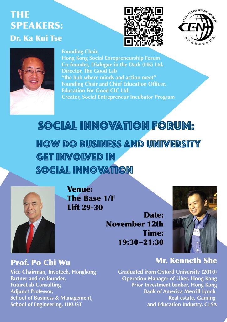 Our first step towards the CEN vision is to hold a social innovation seminar on 17th Mar 2012. The theme is Disruptive Innovation at the Base of the Pyramid. Through the seminar we would set up a platform for social entrepreneurs, investors, NGOs and students to discuss ways to develop innovative and sustainable business models for social benefit. There would be two panel discussions on the issue of Impact of Social Network, and Sustainability of Social Enterprise respectively.