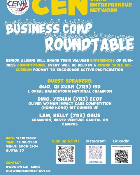 Welcome to CEN Spring Mixer, along with two extraordinary alumni form HKUST who are willing to share their personal experience on business and entrepreneurship with you.